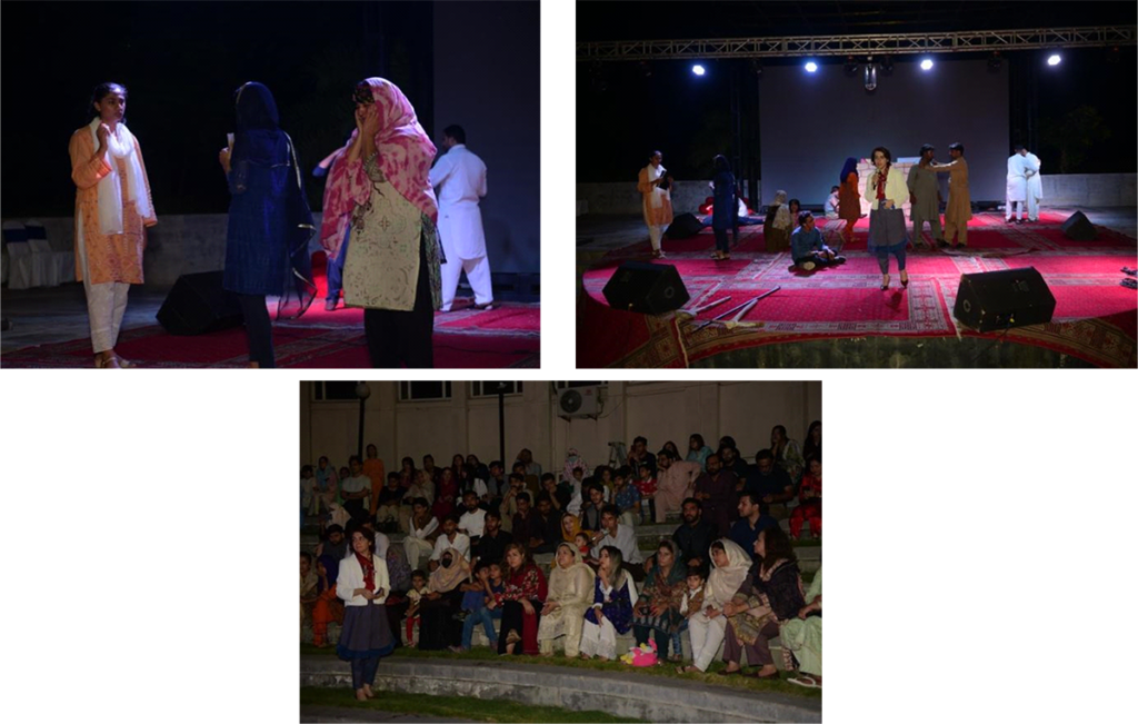 Gatha Art Group by Mafkoora Research and Development Center Peshawar performed a live theatre titled “Breaking the wall.” Director by Wagma Feroz, the play highlighted the irrationality behind violence and revolves around a woman whose son is among the missing persons and a man trying to break a wall. The main cast of the play included Naeem Mukhlis and Roma Khan and almost eleven supporting actors participated in it. The play was interactive, and the audience was inquired questions about why people opt for violence and what better options are available to resolve them peacefully.