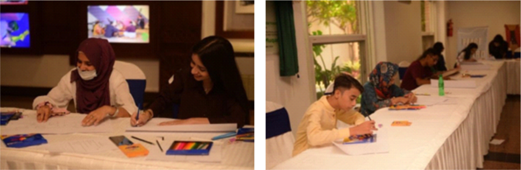 A poster drawing competition was also organized on the theme of imagining the peaceful future of Pakistan where 18 young artists participated. In just a few hours, they created some surprisingly good pieces of art and came up with innovative ideas on what peace means to them. Some notable themes in the artwork included cultural diversity, tolerance, and social harmony. The jury reviewed the artwork and decided three winners from 18 participants based on the originality of the idea and creativity. Dr. Waheed Ahmed presented the award to the winner and held that such a competition can encourage our youth to participate in positive activities.